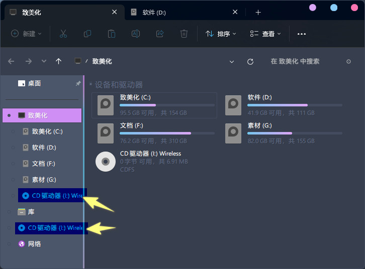 Win10和Win11在默认情况下,可移动驱动器在文件资源管理器的导航栏中显示为单独的组,此外还显示在导航栏中的此电脑组下,如下图: