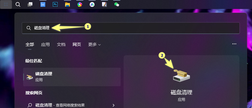 需要注意的是Win11的磁盘属性里面没有磁盘清理的选项,我们需要在开始菜单搜索“磁盘清理”(如下图)
