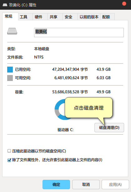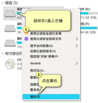 我们可以用系统的清理工具来清理,此方法简单暴力,打开此电脑,在磁盘C上右键 – 属性(如下图)