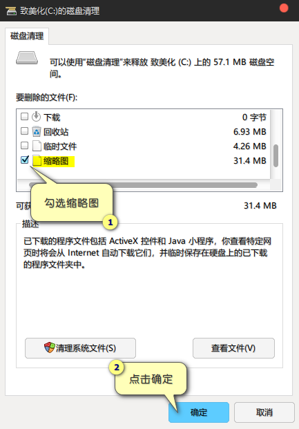 继续上面的操作,在要删除的文件框里面勾选缩略图,点击确定(如下图)