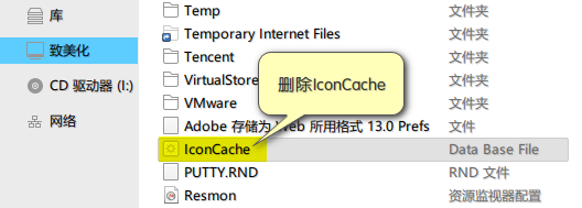 进入 C:\用户\用户名\appdata\local 目录,找到IconCache文件,删除